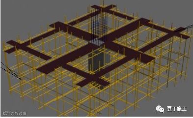 在底板或楼层板结构板面上上弹出梁的边线,便于确定梁两侧立杆位置及梁下立杆布置。