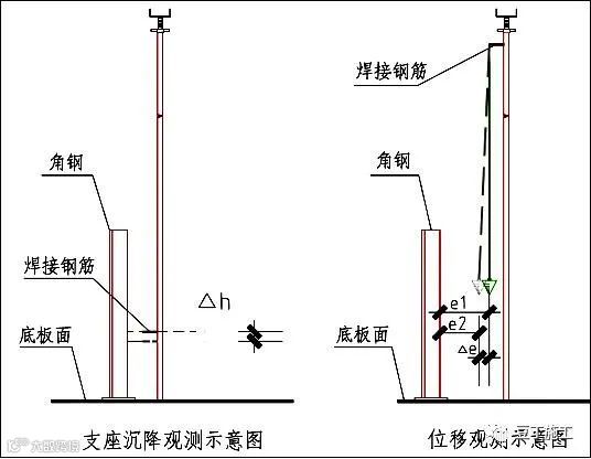 高大模板支撑系统在混凝土浇筑过程中和浇筑后一段时间内,由于受压可能发生一定的沉降和位移,如变化过大可能发生垮塌事故。为及时反映高支模支撑系统的变化情况,预防事故的发生,需要对支撑系统进行沉降和位移监测。
