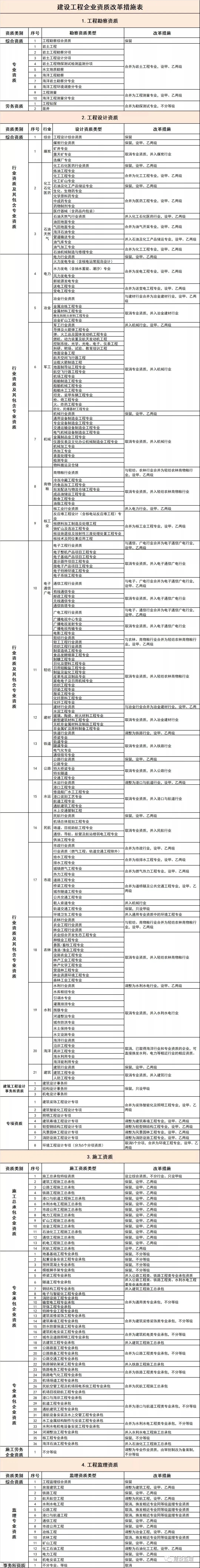 按照国务院深化“放管服”改革部署要求,大幅压减企业资质类别和等级(改革措施详见附件3)。改革后,工程勘察资质分为综合资质和专业资质,工程设计资质分为综合资质、行业资质、专业资质和事务所资质,施工资质分为综合资质、总承包资质、专业承包资质和专业作业资质,工程监理资质分为综合资质和专业资质。