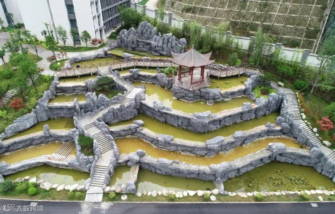 校园内,除随处可见的石砌栏杆外,每栋建筑均有仿唐式建筑屋顶。西南角一处长约50米、落差15米左右的多级瀑布群上建有凉亭,四周有假山、水车、栈道、水景、石拱桥等。