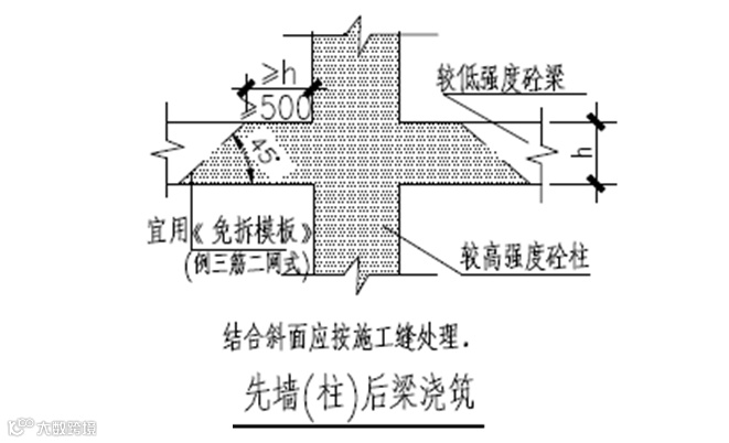 采用钢板网(简易收口网)垂直栏设在节点处,距高强度等级混凝土的墙柱边500mm处,高低不同强度等级混凝土同步浇筑。