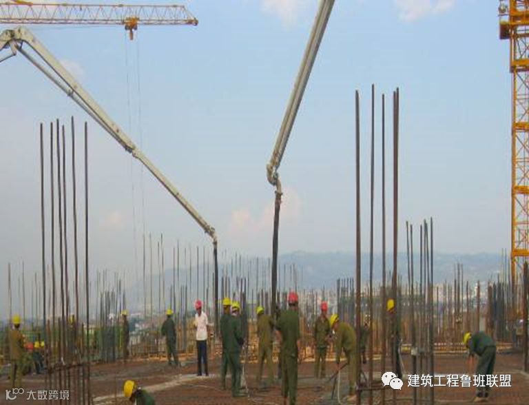 一班工人采用塔吊或混凝土输送泵浇筑高强度等级的柱墙混凝土,另一班人用混凝土输送泵送料浇筑低强度等级的梁板混凝土,