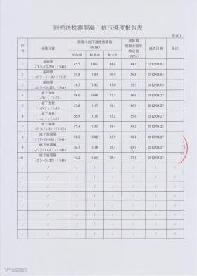 主体实体检测用回弹仪进行回弹检测,从回弹检测数据显示:梁板柱节点处,从柱边四周一米范围内,混凝土强度等级从柱高强度等级逐渐降低致梁板低强度等级,而不是高低强度等级的骤变,