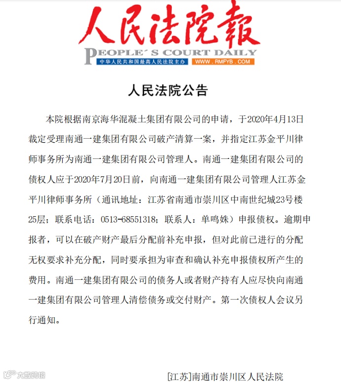 通过公告,大家可以看到,南通一建这个曾经作为建筑行业响亮的品牌,如今已经不复存在。它的破产令人唏嘘不已,这个特殊的历史节点,给人带来些许的猝不及防。