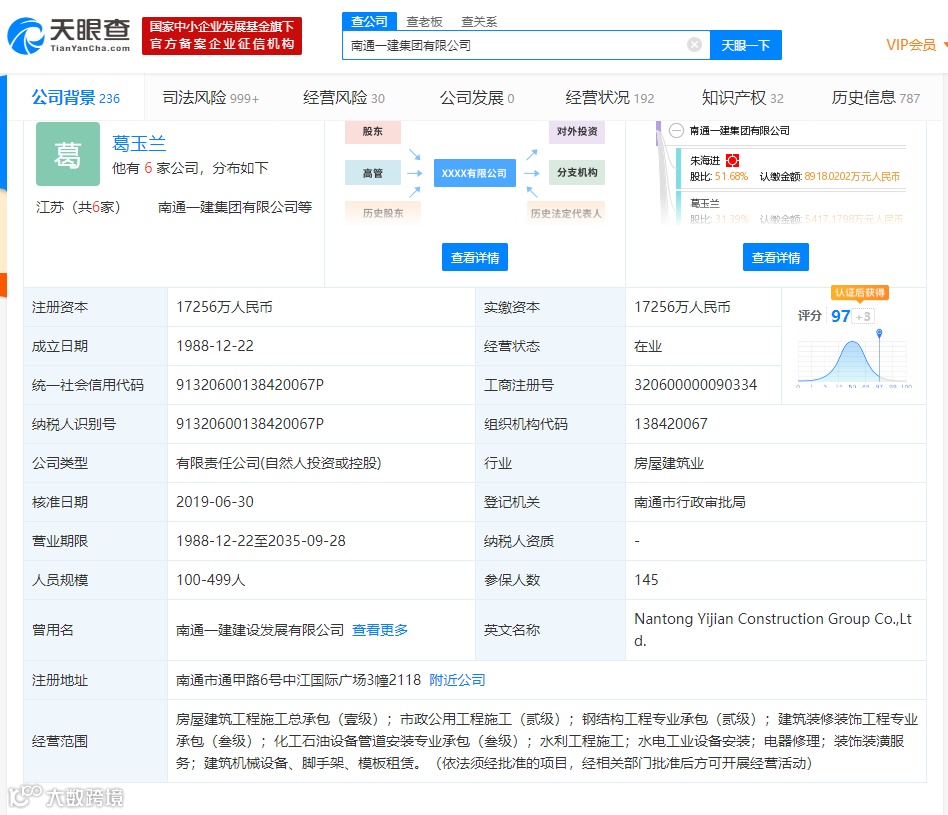 天眼查信息显示,南通一建集团有限公司成立于 1988年12月,注册资本为17256万元人民币,如今的法定代表人为葛玉兰。截止破产前,南通一建具有建筑总承包一级资质,已发展成为集房屋建筑、房地产开发、市政建设于一体的综合性施工企业,拥有7家控股企业。建筑工程项目遍布上海、北京、天津以及本省的南京、苏州、无锡、淮安、南通、徐州等地。