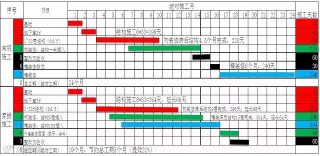 缩短工期是穿插施工最核心的作用,根据不同的项目类型,穿插施工具有不同的应用范围,对一些高层精装项目,通过穿插施工,甚至可节约半年以上的工期。