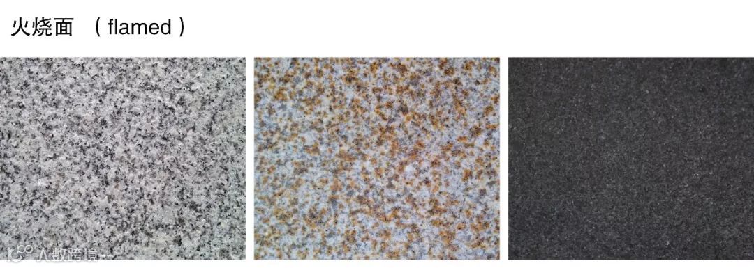(4)火烧面( flamed ):火烧面是指用乙炔、氧气或丙烷、氧气,或石油液化气、氧气为燃料产生的高温火焰对石材表面加工而成的粗面饰面。火烧面对石材的厚度有一定的要求以防止加工过程中石材破裂,一般要求厚度最少为2CM。火烧面表面粗糙自然,不反光,加工快,价格相对便宜。