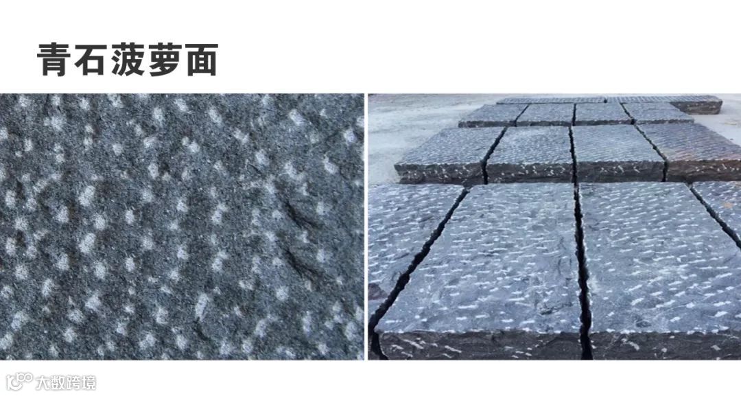 9.青石菠萝面:表面经过大锤敲打煅烧产生如同菠萝皮,表面比荔枝面更加凹凸不平的饰面。