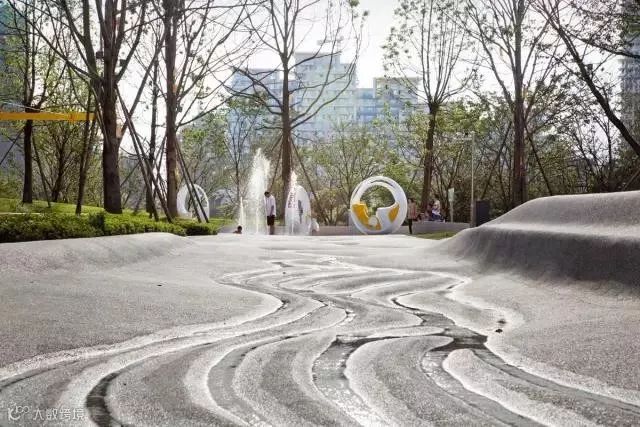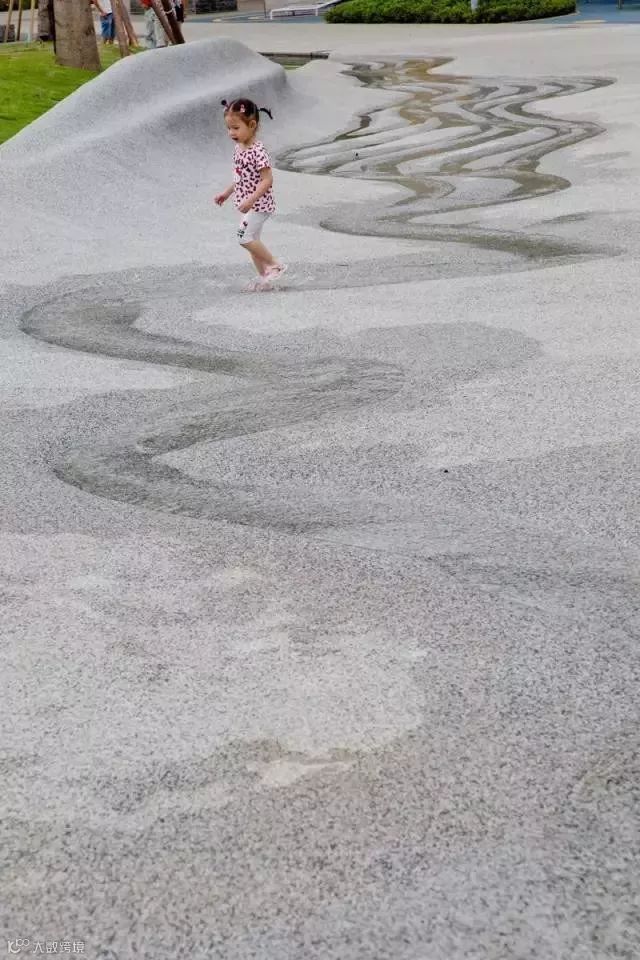 这是结合消防通道的一个改造,用水洗石打磨成凹凸地形,一条蜿蜒曲折,可以充分参与的小溪随之而成。