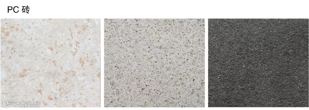 将三种材料从色彩、纹理等方面对比能粗略得到鲜明特征:石英砖最坚固厚重;人造岗石纹样式种类多;PC砖性价比最高。成本受限制时,PC砖会是一种不错的选择。