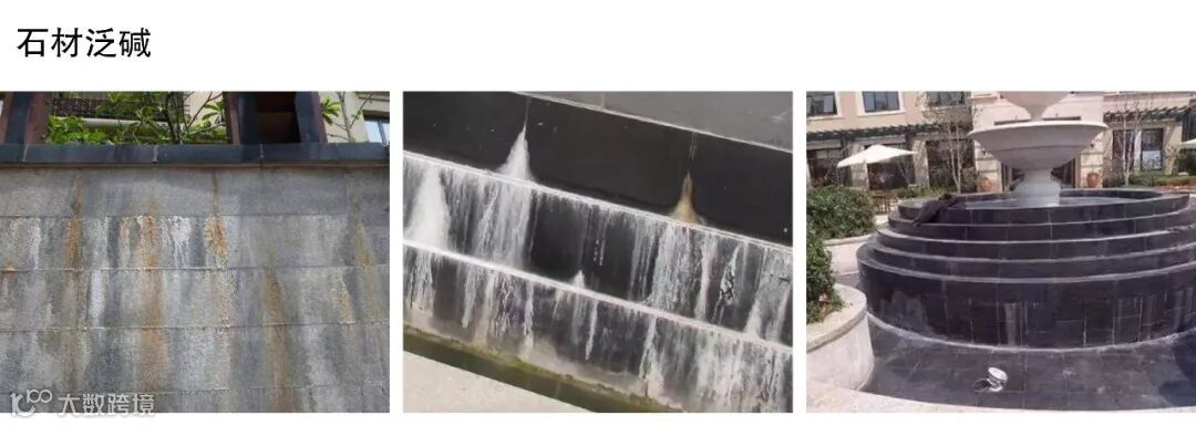 (2)泛碱:泛碱是水分把石材本身及结合材料中含有的碱、盐等物质沿石材的毛细孔、板缝游离出来,经蒸发后残留在石材表面的白色结晶物质。在设计过程中,应该预先考虑到石材泛碱现象。