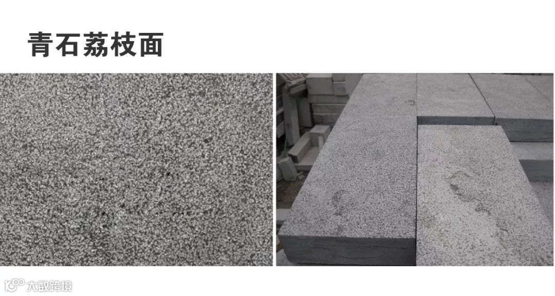5.青石荔枝面:石材表面经过机器力的敲打后产生凹凸不平(如同荔枝皮)的饰面效果。常用于台阶和路面防滑铺装,墙面的垂直饰面等。