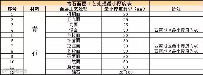 ▼注意:不同青石面层工艺处理对青石厚度的要求不同,下表可清晰反映出各种青石面层工艺处理要求的最小厚度:
