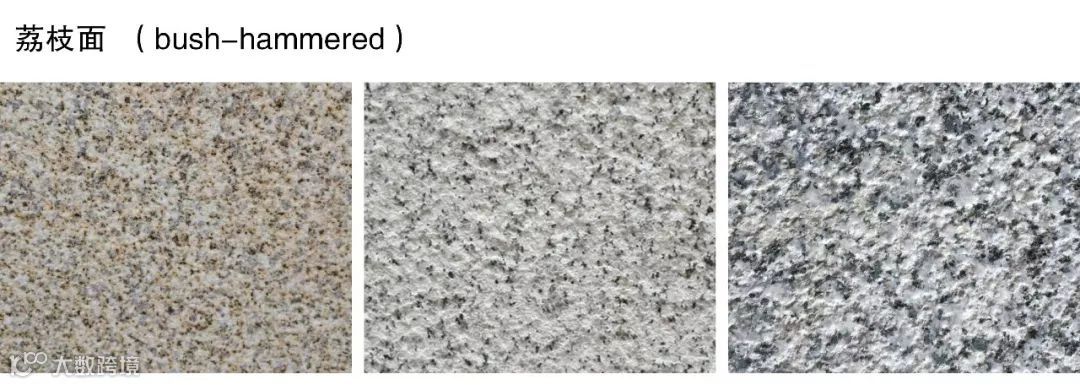 (5)荔枝面(bush-hammered):荔枝面是用形如荔枝皮的锤子在石材表面敲击,从而在石材表面形成形如荔枝皮的粗糙表面,分为机荔枝面(机器)和手荔枝面(手工)两种。