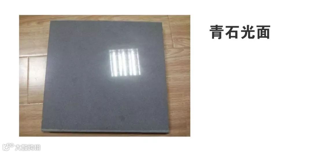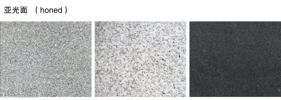 (2)亚光面( honed ):亚光面是指表面平整,用树脂磨料等在表面进行较少的磨光处理。其光度较磨光面低,一般在30-50、60左右。具有一定的光度,但对光的反射较弱。表面平整光滑,光度很低的板材。