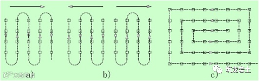(2)打桩顺序一般按先深后浅、先长桩后短桩、先大径后小径、先施工大承台桩后施工小承台桩的原则,由于桩的密集程度不同,可自中间分两向对称前进,或自中间向四周进行;当一侧毗邻建筑物时,由毗邻建筑物处向另一方向施打。