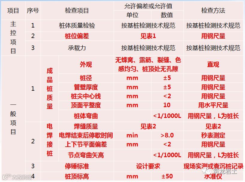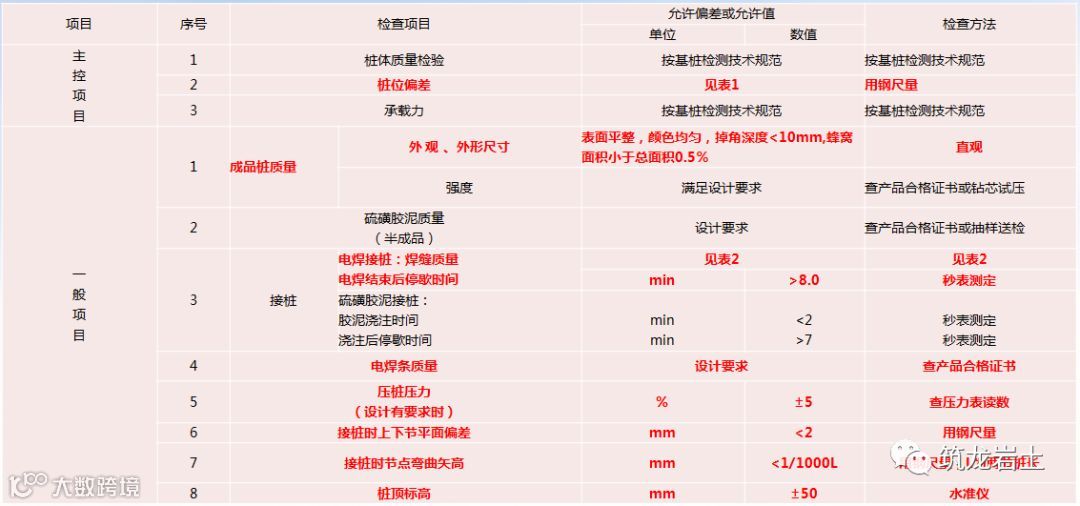 注:①表1、2、3、4选自GB50202-2002《建筑地基基础工程施工质量验收规范》其中个别数据依据JGJ94-2008《建筑桩基技术规程》做了相应调整;②表中“基桩检测技术规范”参见JGJ106-2014《建筑基桩检测技术规范》。