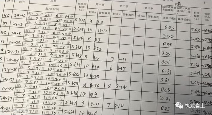 (3)管桩表面应每米划线标记,以便做好打桩记录,打桩记录应包括入土深度、送桩深度、桩顶标高、最后贯入度、桩锤落距等施工参数。