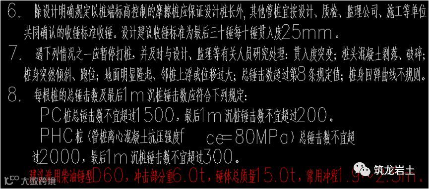 PC桩总锤击数不宜超过2000,最后1m沉桩锤击数不宜超过250;