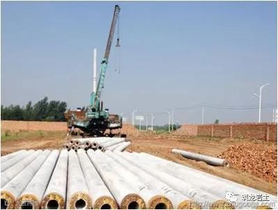 先拴好吊桩用的钢丝绳及索具,管桩在施工中起吊,可采用一点法(位置距桩头0.29L处),启动吊车吊桩,使桩尖垂直对准桩位中心,缓缓放下插入土中,位置要准确;检查桩顶扣好桩帽或桩箍后,即可除去索具。