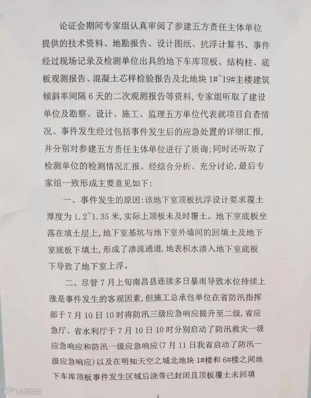 论证会期间专家组认真审阅了参建五方责任主体单位提供的技术资料、地勘报告、设计图纸、抗浮计算书、事件经过现场记录及检测单位出具的地下车库顶板、结构柱、地板观测报告、混凝土芯样检验报告及北地块1#-19#主楼建筑倾斜率间隔6天的二次观测报告等资料,专家组听取了建设单位及勘查、设计、施工、监理五方单位代表就项目自查情况、时间发生经过包括时间发生后的应急处置的详细汇报,并分别对参建五方责任主体单位进行了质询;