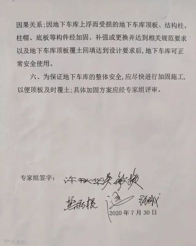 因地下车库上浮而受损的地下车库顶板、结构柱、柱帽、地板等构件经加固、补强或更换并达到相关规范要求以及地下车库顶板覆土回填达到设计要求后,地下车库可正常安全使用。