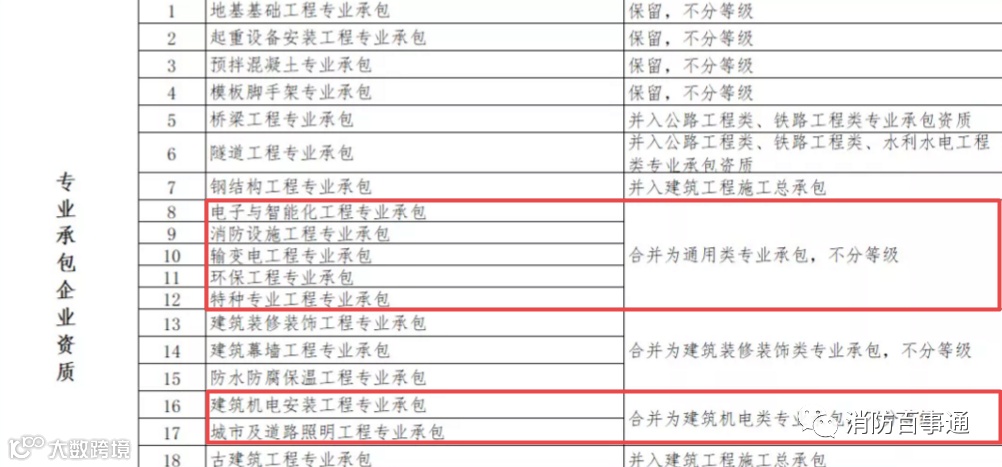 消防设施施工专业承包资质和其他几项资质合并为通用类专业承包,不分等级。