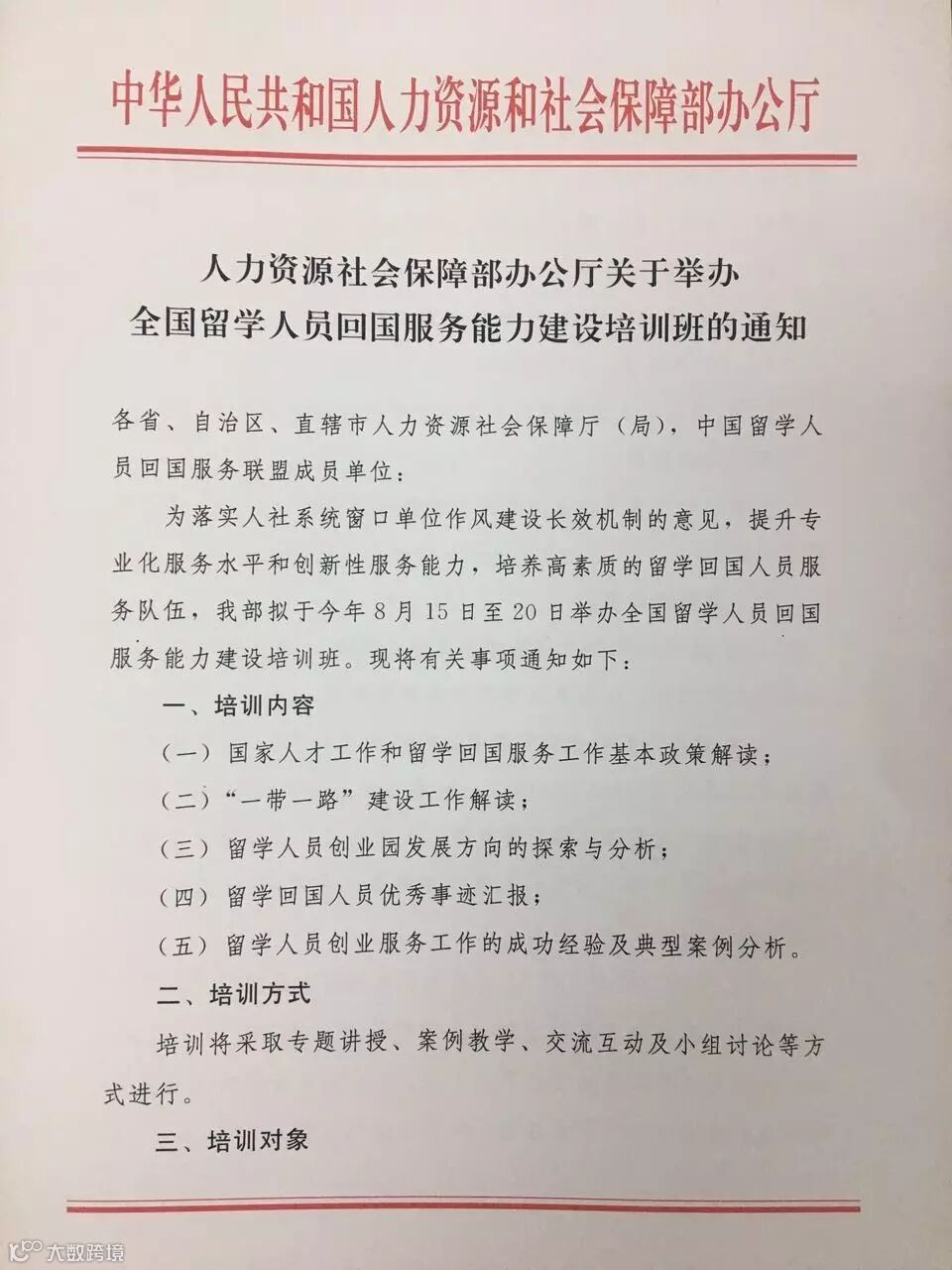 导读:为落实人社系统窗口单位作风建设长效机制的意见,提升专业化服务水平和创新性服务能力,培养高素质的留学回国人员服务队伍,我部拟于今年8月15日至20日举办全国留学人员回国服务能力建设培训班。