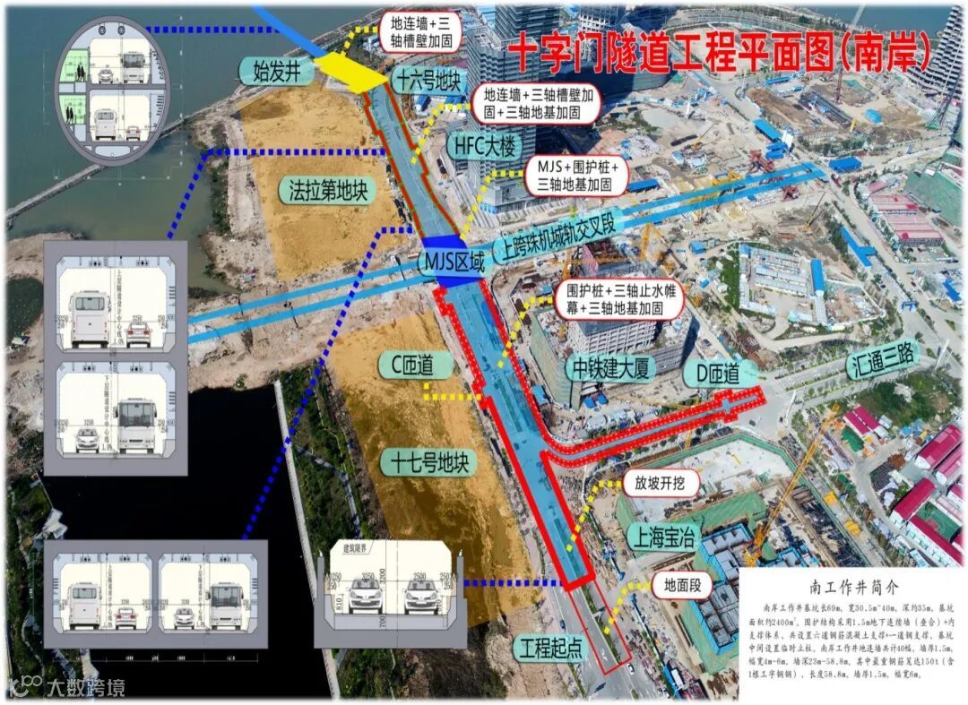 珠海十字门隧道项目位于珠海市横琴新区和香洲区,隧道左线全长1905米,右线全长2657米,其中盾构段长940米,分为一期连接线明挖法和二期盾构法施工,中建三局一公司负责一期连接线施工。