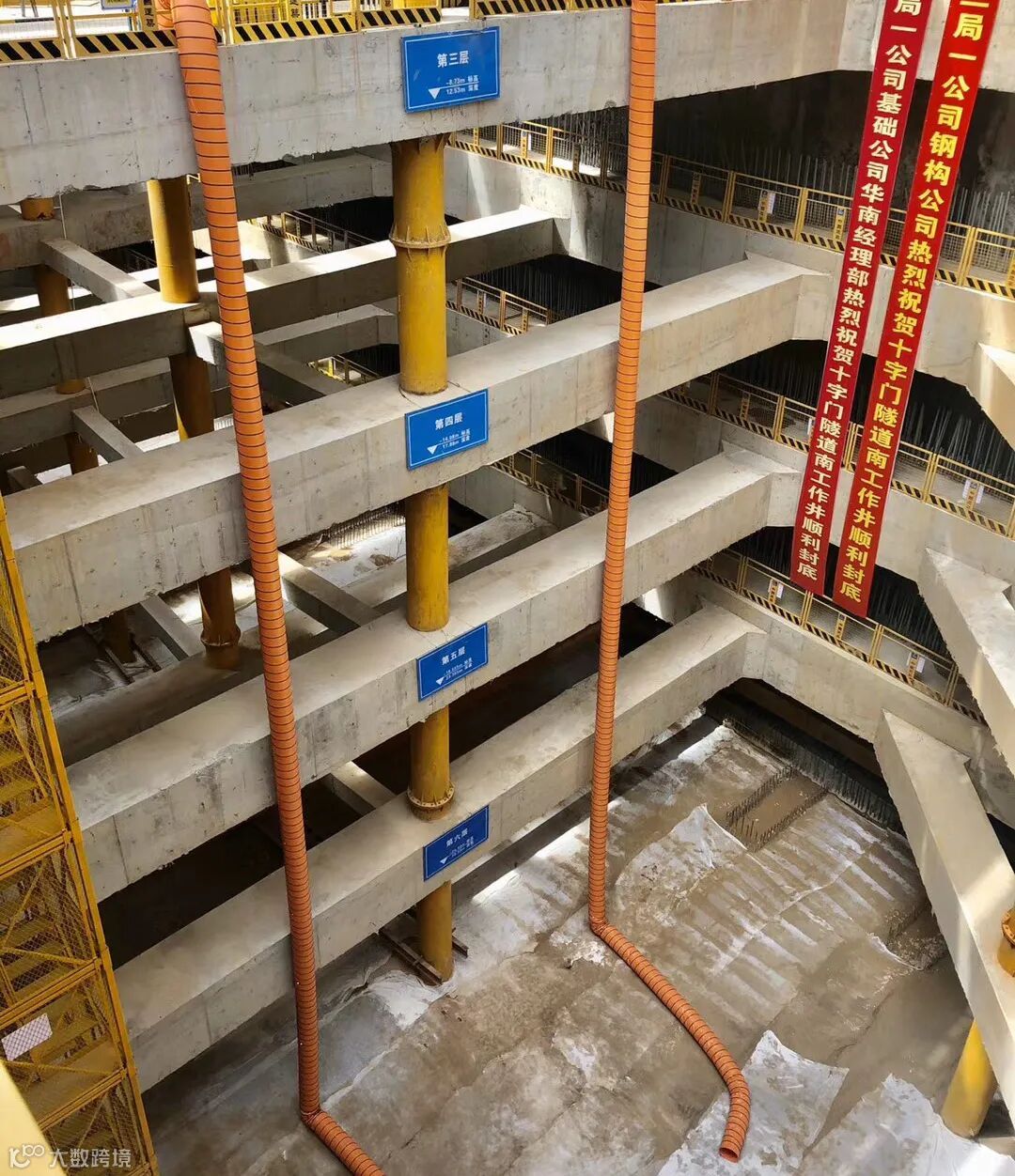 淤泥层混凝土支撑施工采用3米松木桩及混凝土垫层确保承载力;环梁施工每3米预留浇筑孔,每1米预留振捣孔,第3至6层环梁施工期间分段预埋盾构钢环,采用红外线测量仪将精度控制在10毫米内。