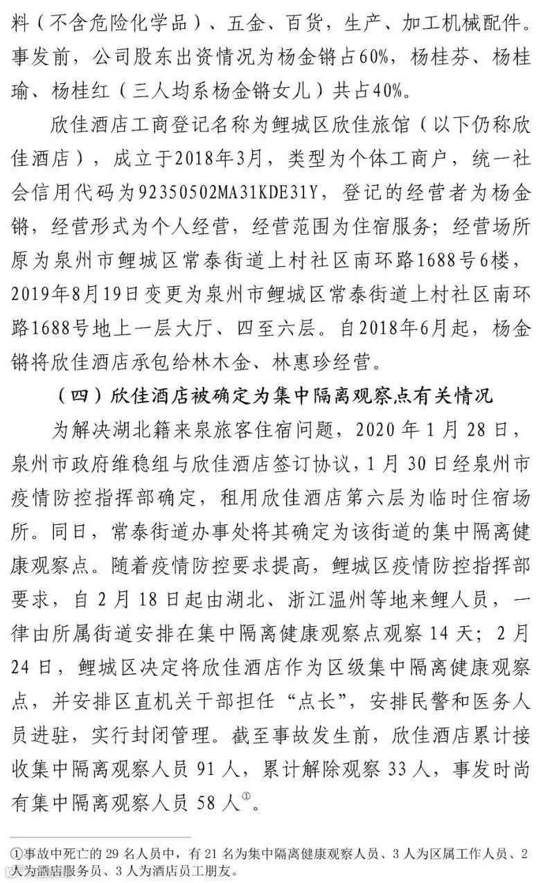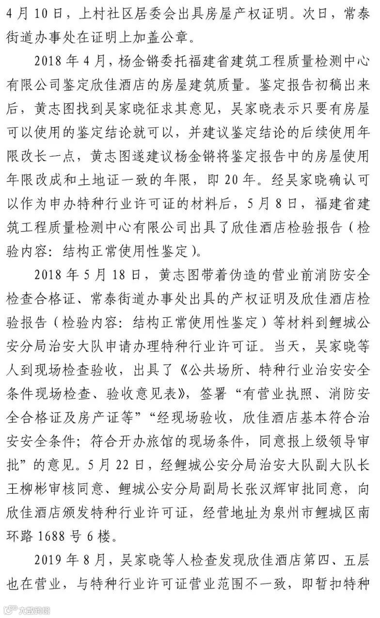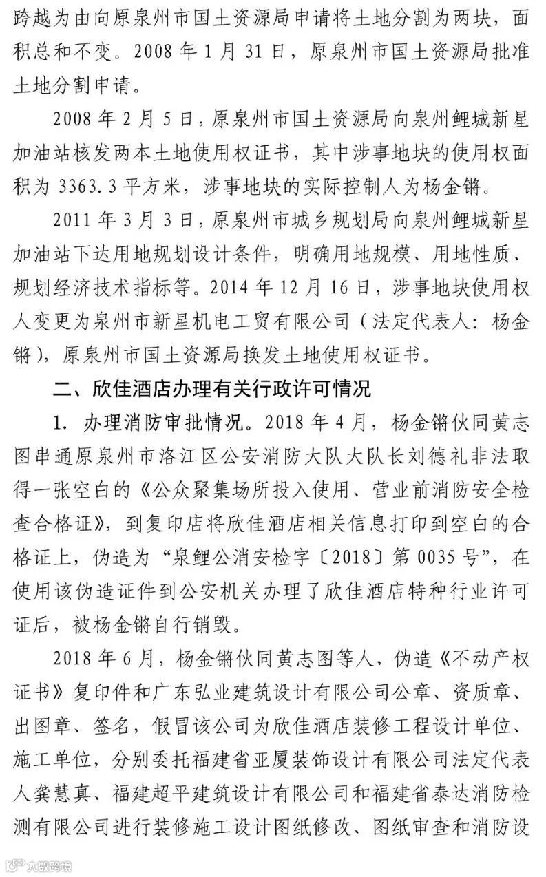 泉州市新星机电工贸公司、欣佳酒店实际控制人杨金锵以涉嫌重大责任事故罪、伪造国家机关证件罪于4月9日被逮捕;