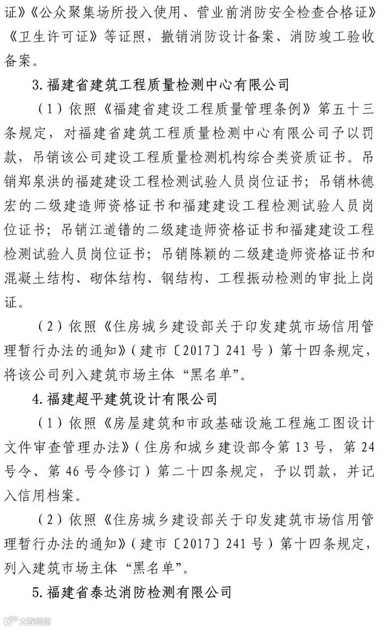 福建省建筑工程质量检测中心有限公司、福建超平建筑设计有限公司、福建省泰达消防检测有限公司、福建省亚厦装饰设计有限公司、湖南大学设计研究院有限公司违规承接业务,出具虚假报告,制作虚假材料帮助事故企业通过行政审批。