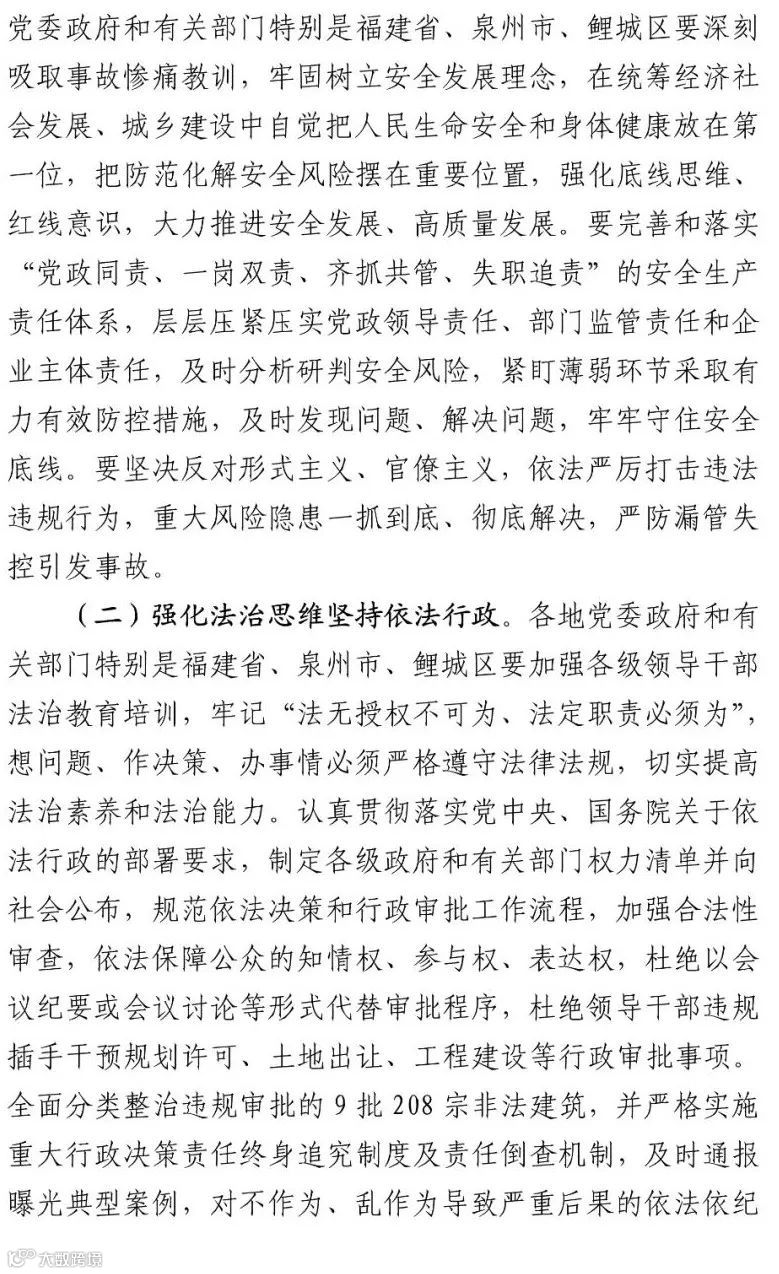 福建省纪检监察机关对该起事故中存在失职失责问题的41名公职人员给予党纪政务处分,1人予以诫勉。其中:省管干部9人、泉州市管及以下干部33人;主要领导责任14人、重要领导责任5人、监督责任2人、直接责任21人;厅级干部7人、处级干部13人、其他22人。