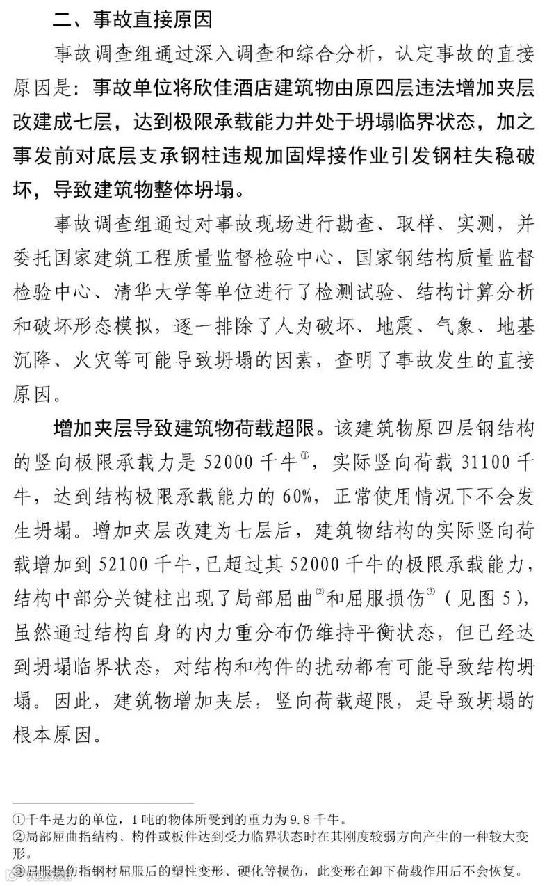 事故责任单位泉州市新星机电工贸有限公司将欣佳酒店建筑物由原四层违法增加夹层改建成七层,达到极限承载能力并处于坍塌临界状态,加之事发前对底层支承钢柱违规加固焊接作业引发钢柱失稳破坏,导致建筑物整体坍塌。
