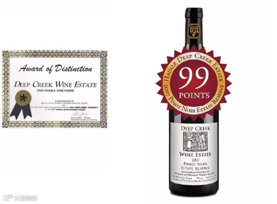 “2007PINOT NOIR”干红葡萄酒2011年在法国葡萄酒大赛上得分99分(满分100分),并连续4年蝉联桂冠:“THEBEST PINOT NOIR IN THE WORLD” “世界上最好的黑皮诺”。