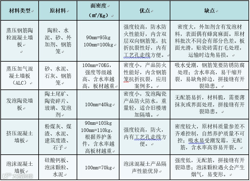 ✔轻质条板类墙体根据加工工艺和基质材料不同而形成不同的产品,主要类型包括蒸压陶粒混凝土墙板、蒸压加气混凝土墙板(ALC板)、挤压混凝土墙板、泡沫混凝土墙板、发泡陶瓷墙板等。