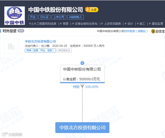 4月29日,中国中铁股份有限公司新增对外投资,被投资方为中铁北方投资有限公司,认缴金额为50亿元,持股比例为100%。关于中铁北方投资公司,即中铁北方区域总部(中铁北方投资公司)实行“一个机构,两块牌子”的管理模式。