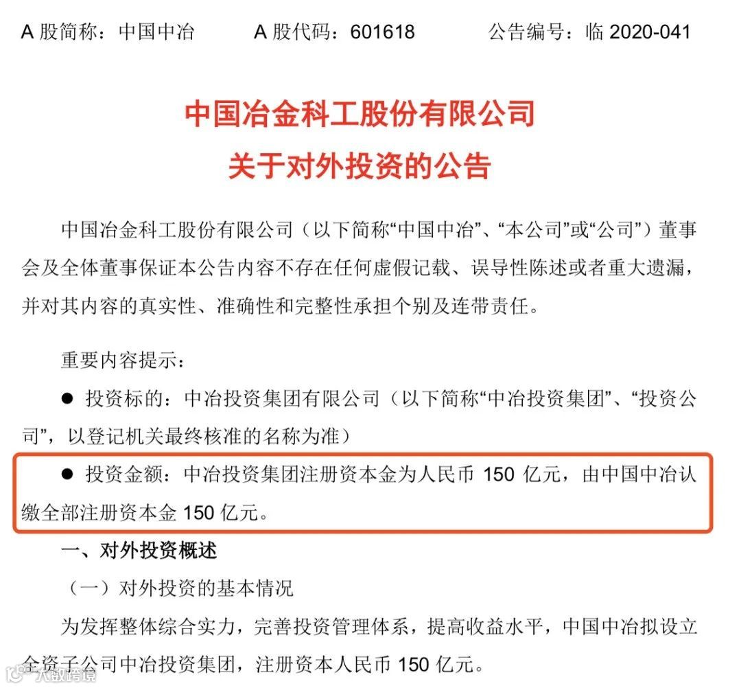 5月4日消息,中国中冶发公告称,为发挥整体综合实力,完善投资管理体系,提高收益水平,中国中冶拟设立全资子公司中冶投资集团,注册资本人民币150亿元。