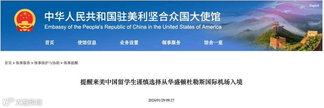 2024年1月29日,中国驻美使馆发布关于赴美中国留学生谨慎选择从华盛顿杜勒斯国际机场入境的提醒。
