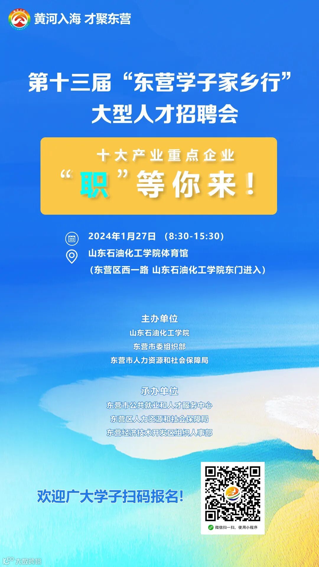 律回春渐、新元肇启。在崭新的2024年蓄势待发、全新启航的奋进时刻,我们用最大的诚意、最好的服务,热烈欢迎海内外优秀学子齐聚美丽的黄河入海口,与您共同相约第十三届“东营学子家乡行”大型人才招聘会!