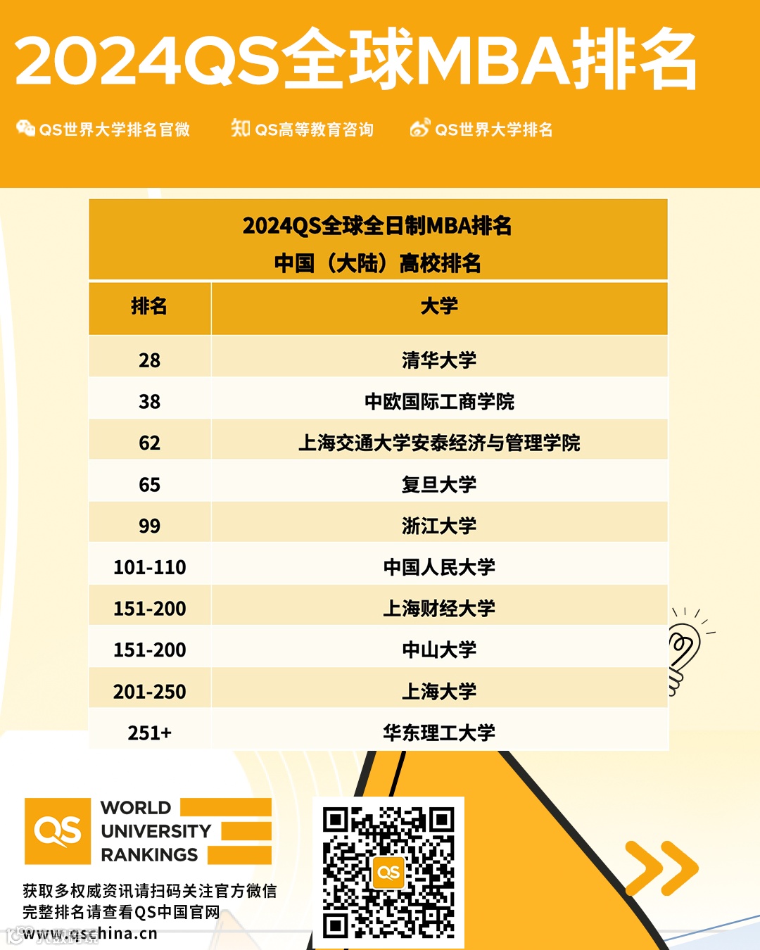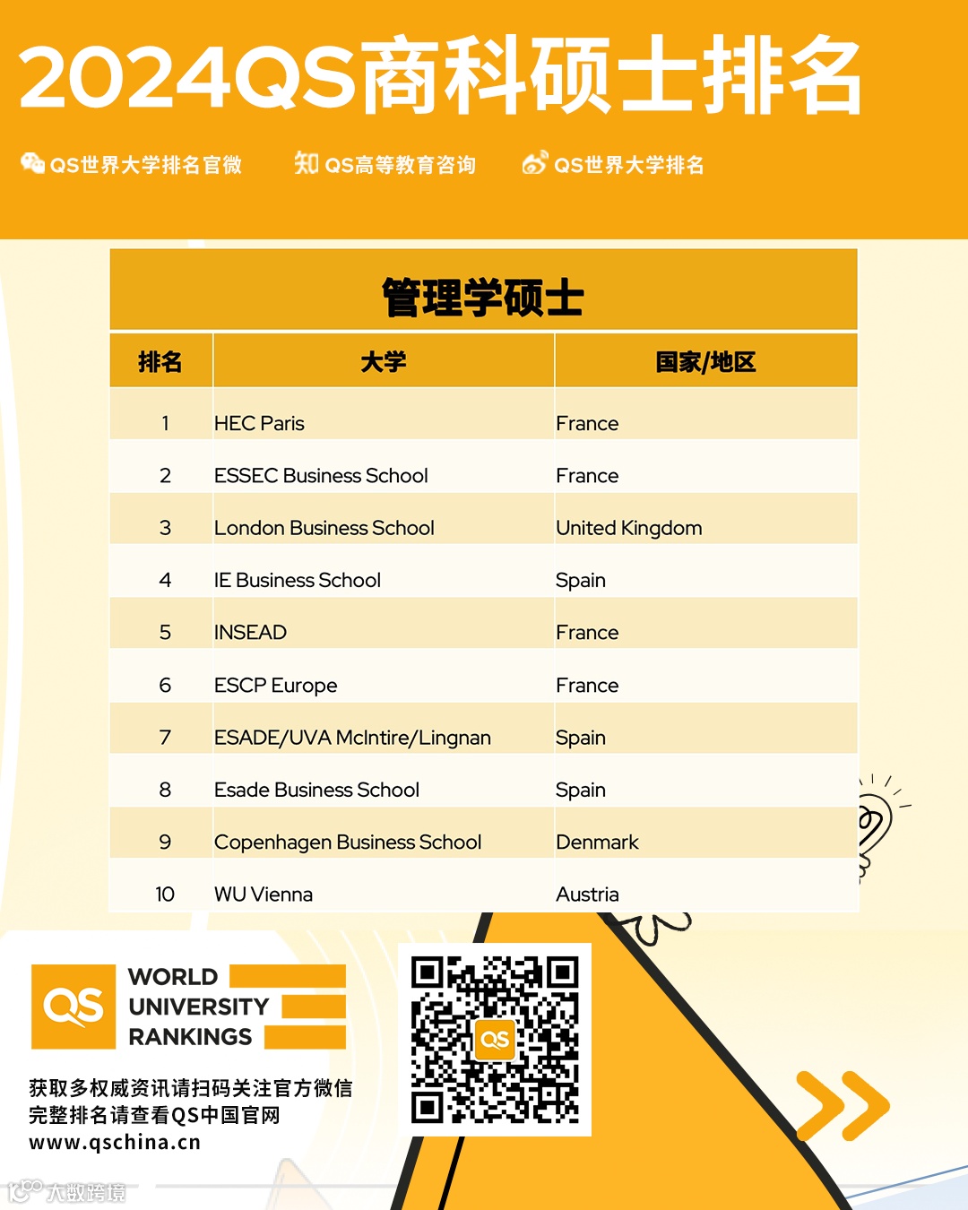 10月25日,全球高等教育研究机构 QS(Quacquarelli Symonds)发布了 2024 全球全日制 MBA 以及商科硕士排名。