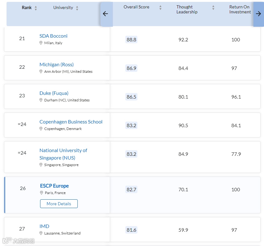 欧洲大陆地区的其他部分商学院同样表现不俗。巴黎高等商学院(HEC)拥有欧洲大陆排名最高的 MBA 项目,位列全球第 5 名;来自西班牙的 IE 商学院,位列全球第 8 名,ISES 商学院位列全球第 9 名;法国 INSEAD 欧洲管理学院紧随其后,位列第 11 名。