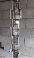 (2)在门洞口两侧墙体底部反坎向上按照“隔一放一“的原则间隔放置预制混凝土砌块,直至过梁底部;窗洞口两侧在窗台上放置第一块,然后向上按照“隔一放一”的原则间隔放置预制混凝土砌块,直至过梁底部。