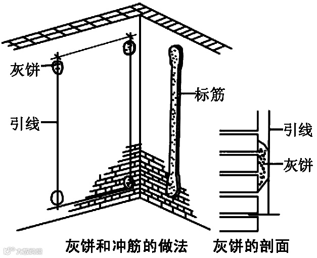 根据墙面的平整度和垂直度,决定抹灰厚度(最薄处不小于7mm),先在墙的上角各做一个标准灰饼(直径约5cm),然后用托线板吊线做墙下角的灰饼,再挂线每隔1.2~1.5m 加做若干标准灰饼,上下灰饼之间抹宽度约10cm的砂浆冲筋,木杠刮平。