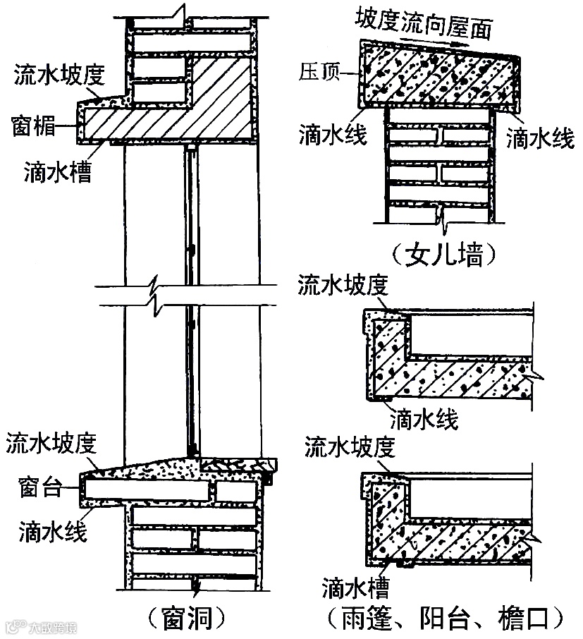 外墙窗台、窗楣、雨篷、阳台、压顶和突出墙面腰线等,上面应做流水坡度(一般10%),下面应做滴水线或滴水槽,其深度和宽度均不小于10mm。
