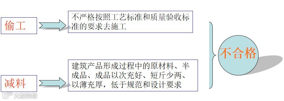 施工单位(包括总包、分包、班组):材料质量低于设计和规范要求,施工过程不按施工工艺标准和质量验收标准进行施工。