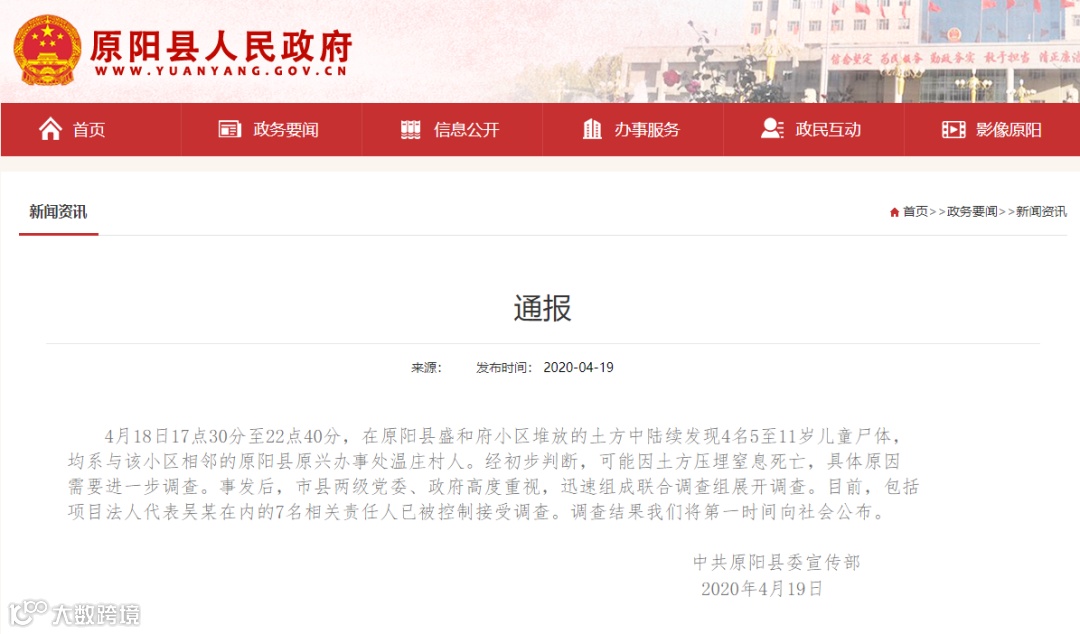 河南原阳县委宣传部4月19日凌晨发布通报,4月18日17点30分至22点40分,在原阳县盛和府小区堆放的土方中陆续发现4名5至11岁儿童尸体,均系与该小区相邻的原阳县原兴办事处温庄村人。