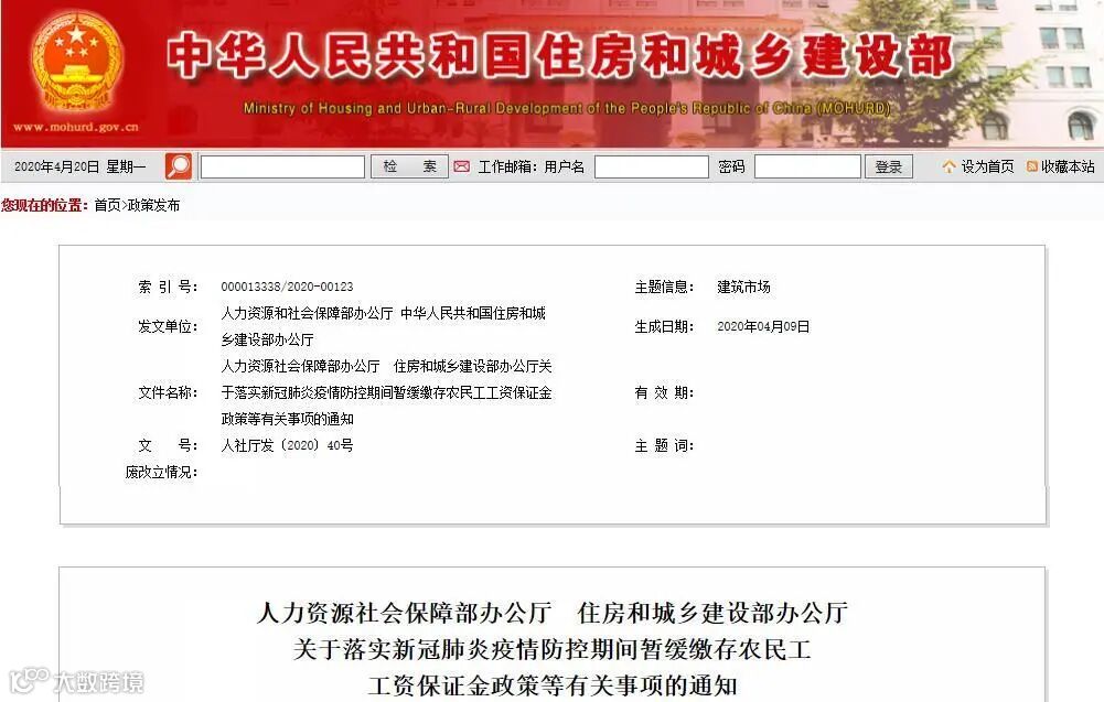 4月20日,人社部、住建部发布《关于落实新冠肺炎疫情防控期间暂缓缴存农民工工资保证金政策等有关事项的通知》,指出政策实施期内新缴存的农民工工资保证金要尽快返还。
