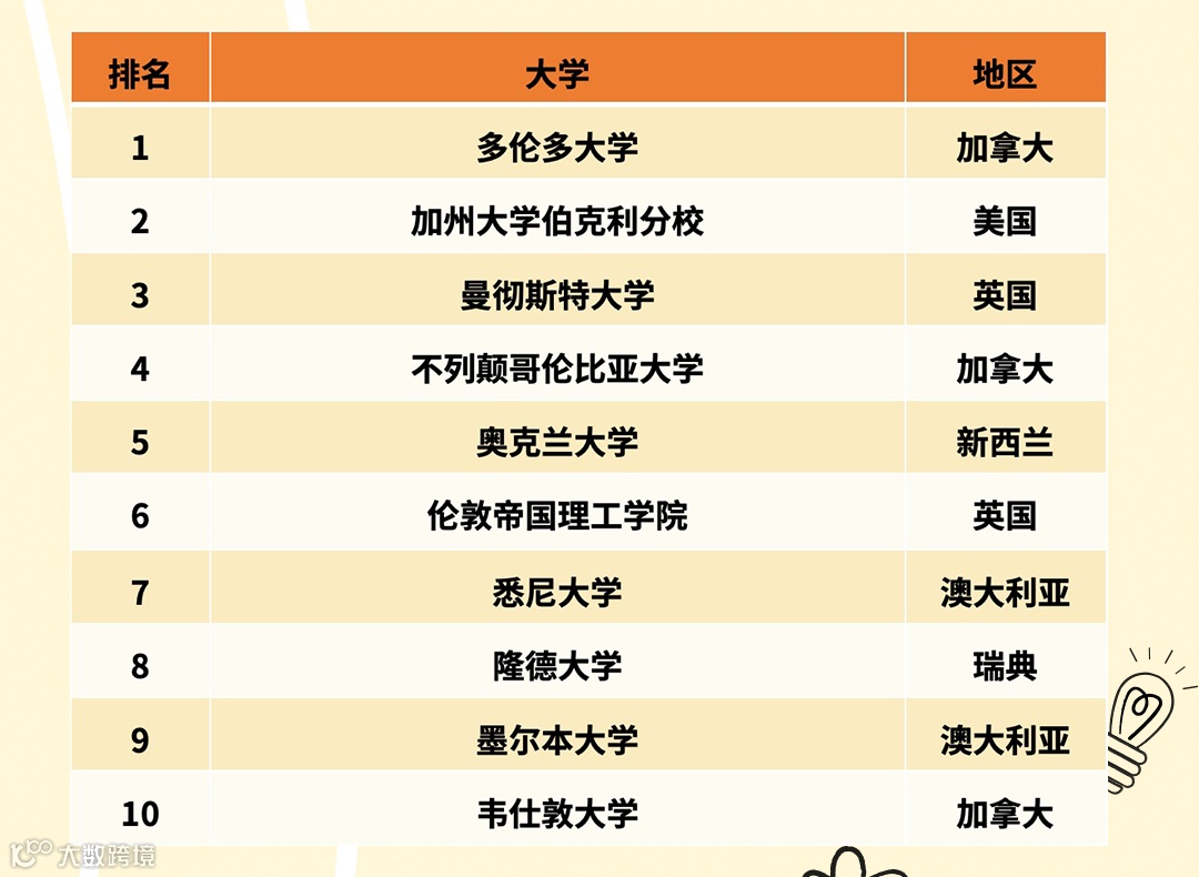 前10名大学分别是:加拿大多伦多大学、美国加州大学伯克利分校、英国曼彻斯特大学、加拿大英属哥伦比亚大学、新西兰奥克兰大学、英国伦敦帝国学院、澳大利亚悉尼大学、瑞典隆德大学、澳洲墨尔本大学,以及加拿大西安大略大学。