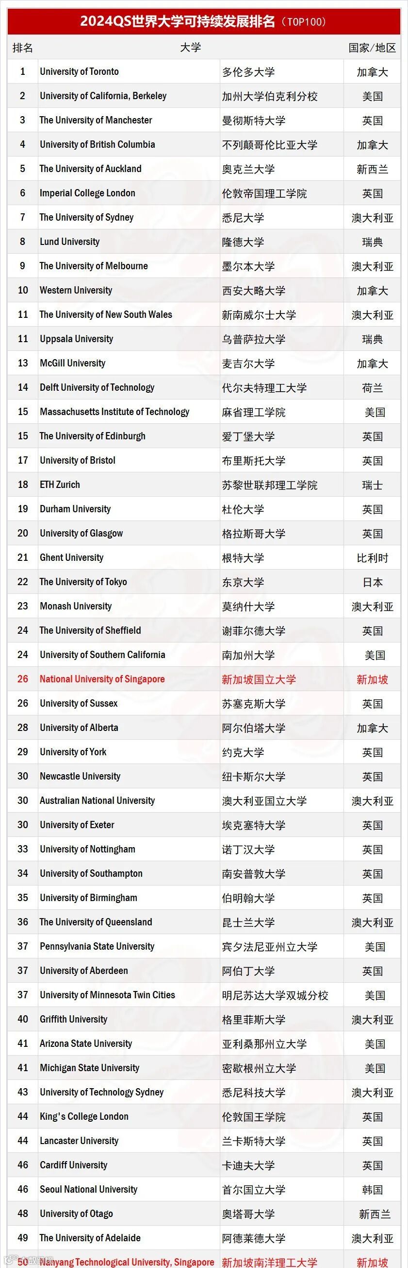 新加坡国立大学和南洋理工大学,在QS2024世界大学可持续发展排名中,首次进入前五十,分列第26和第50名。新加坡管理大学也首次入榜,排名第481名。